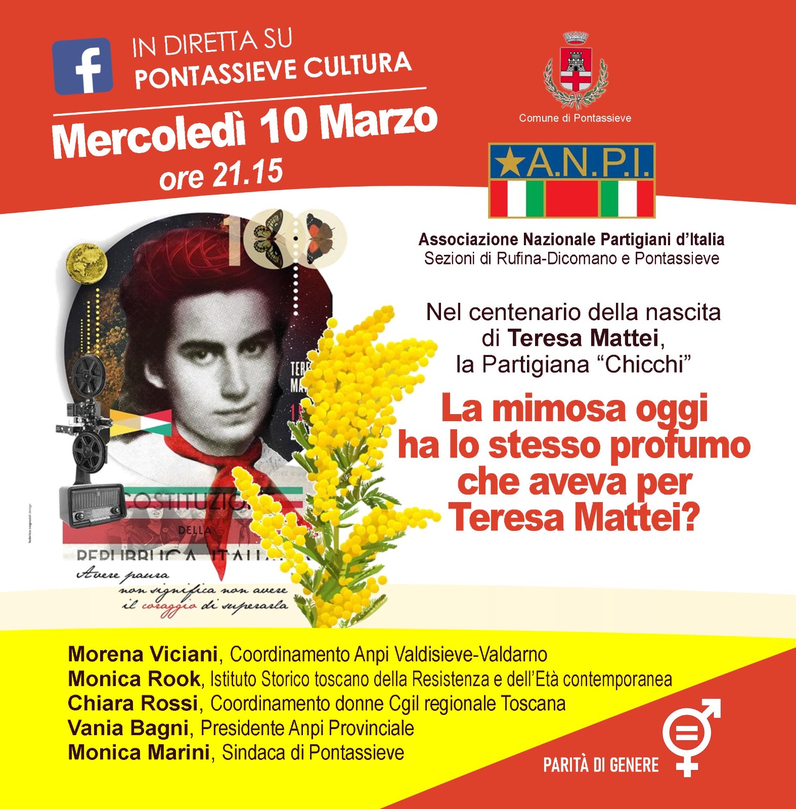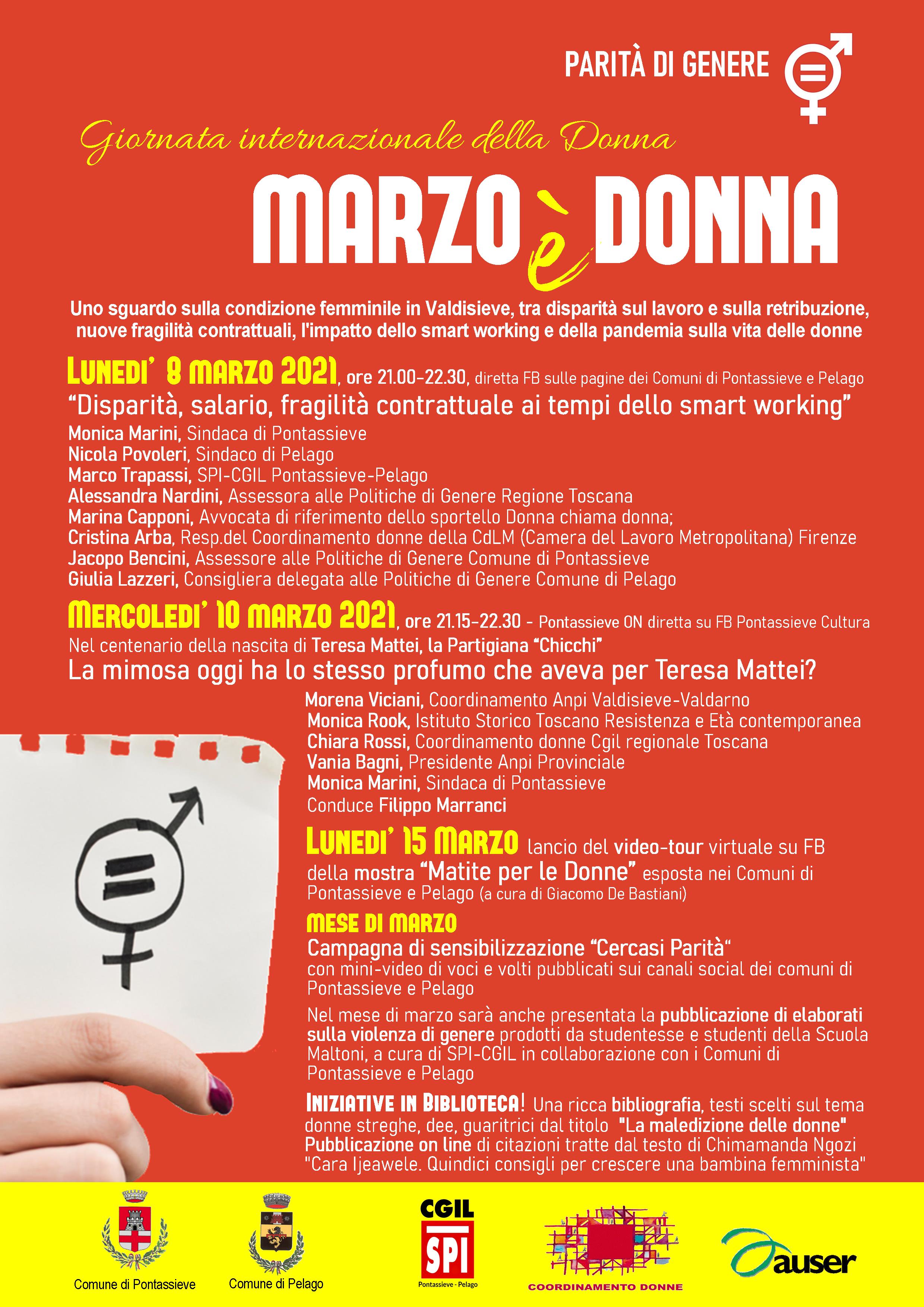 Il primo evento è in programma lunedì 8 marzo alle ore 21 in diretta sui canali Facebook di Pontassieve e Pelago e avrà come tema “Disparità, salario, fragilità contrattuale ai tempi dello smart working”. Mercoledì 10 marzo ore 21.15-22.30 all’interno degli appuntamenti di Pontassieve ON in diretta su FB Pontassieve Cultura, incontro sul centenario della nascita di Teresa Mattei, la Partigiana “Chicchi” dal titolo “La mimosa oggi ha lo stesso profumo che aveva per Teresa Mattei?”