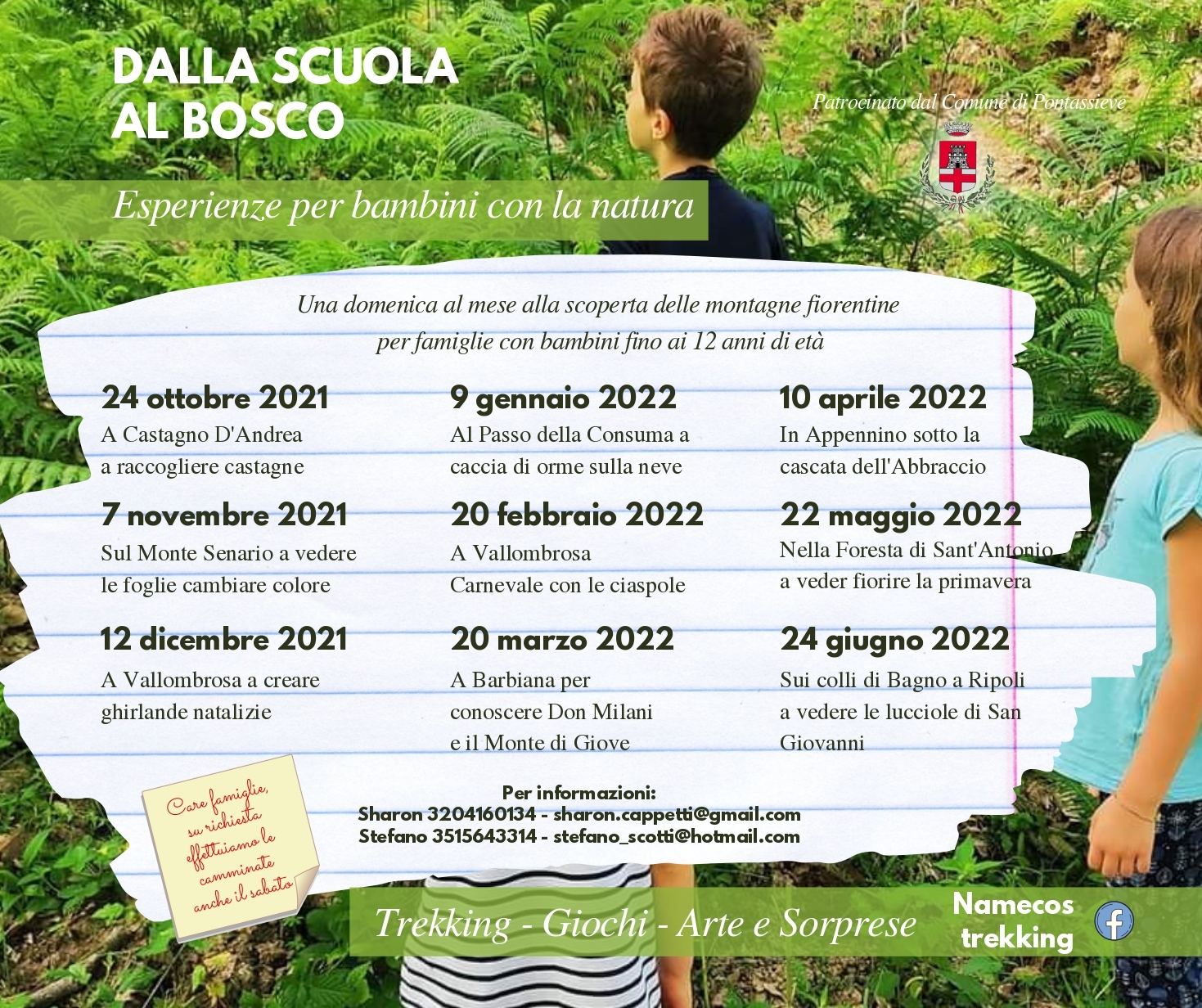 Il Comune di Pontassieve patrocina il progetto Dalla Scuola al bosco, realizzato dall’associazione Namecos trekking. Una serie di escursioni per famiglie - con figli fino a 12 anni - per scoprire le montagne intorno al nostro territorio in un ciclo di appuntamenti per vivere a contatto diretto la natura. Da ottobre fino a giugno 2022 tante occasioni da Montesenario a Barbiana, dalla Consuma a Vallombrosa. L’elenco completo al link