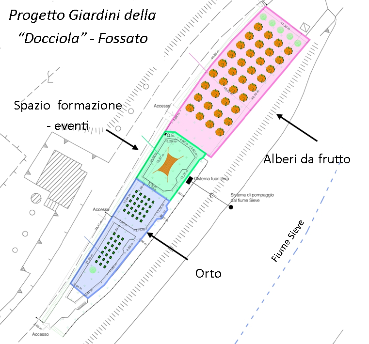 Alla “Docciola”, oltre ad un generale restyling del parco e delle sedute (che aumenteranno di numero) saranno impiantati alberi da frutto di specie autoctone, sarà realizzato una nuova area eventi, uno spazio destinato ad attività di formazione, svago, incontro, oltre ad un’area destinata ad ospitare orti fuori terra in cassoni di legno destinati ad una gestione collettiva ed aperta a visite ed attività degli alunni delle scuole, comunque nell’ottica di un rilancio della vivibilità e fruibilità di quella zona fluviale del capoluogo, già ampiamente frequentata da giovani e meno giovani.