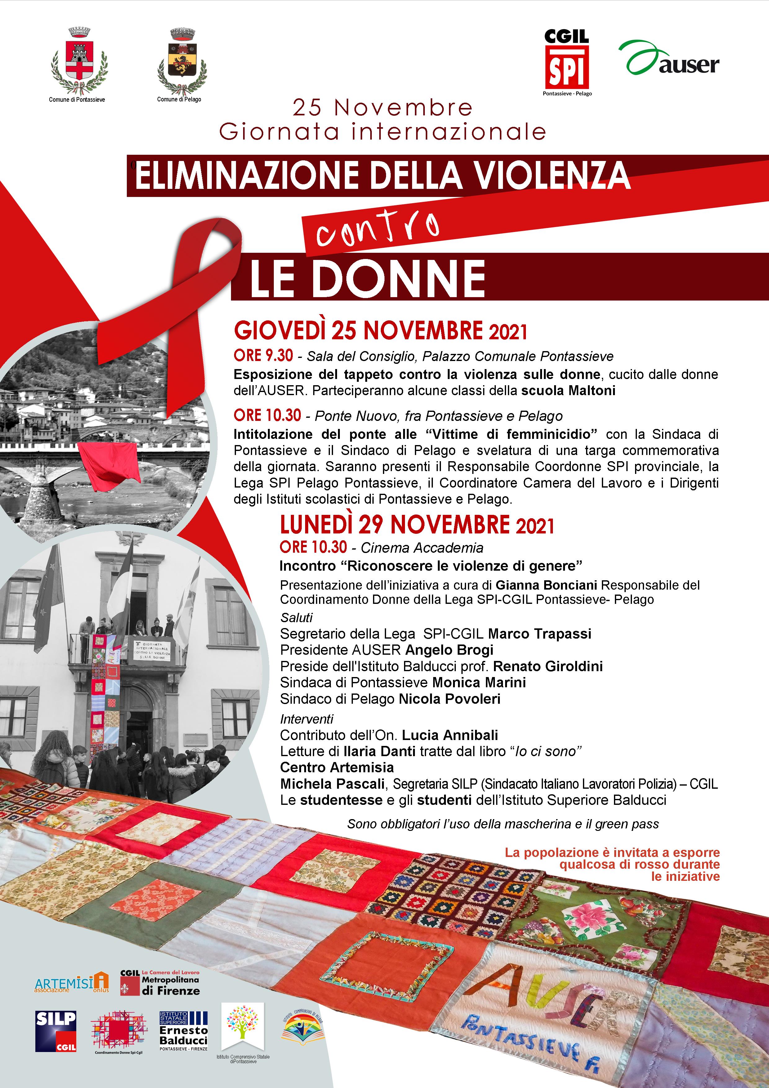 Pontassieve, 22 novembre 2021 - Lo SPI CGIL Pontassieve e Pelago e Auser in collaborazione con i Comuni di Pontassieve e Pelago organizzano una serie di iniziative per la “giornata Internazionale contro la violenza sulla donne”. Giovedì 25 novembre alle ore 9,30 in sala del Consiglio comunale di Pontassieve verrà esposto il “tappeto” contro la violenza sulle donne, un manufatto sartoriale che l’Auser ha creato e che ogni anno si arricchisce con stoffe e che è ormai un’opera di patchwork che racchiude un grande significato simbolico. L’occasione vedrà anche una serie di letture, realizzate da una rappresentanza di classi della scuola Maria Maltoni