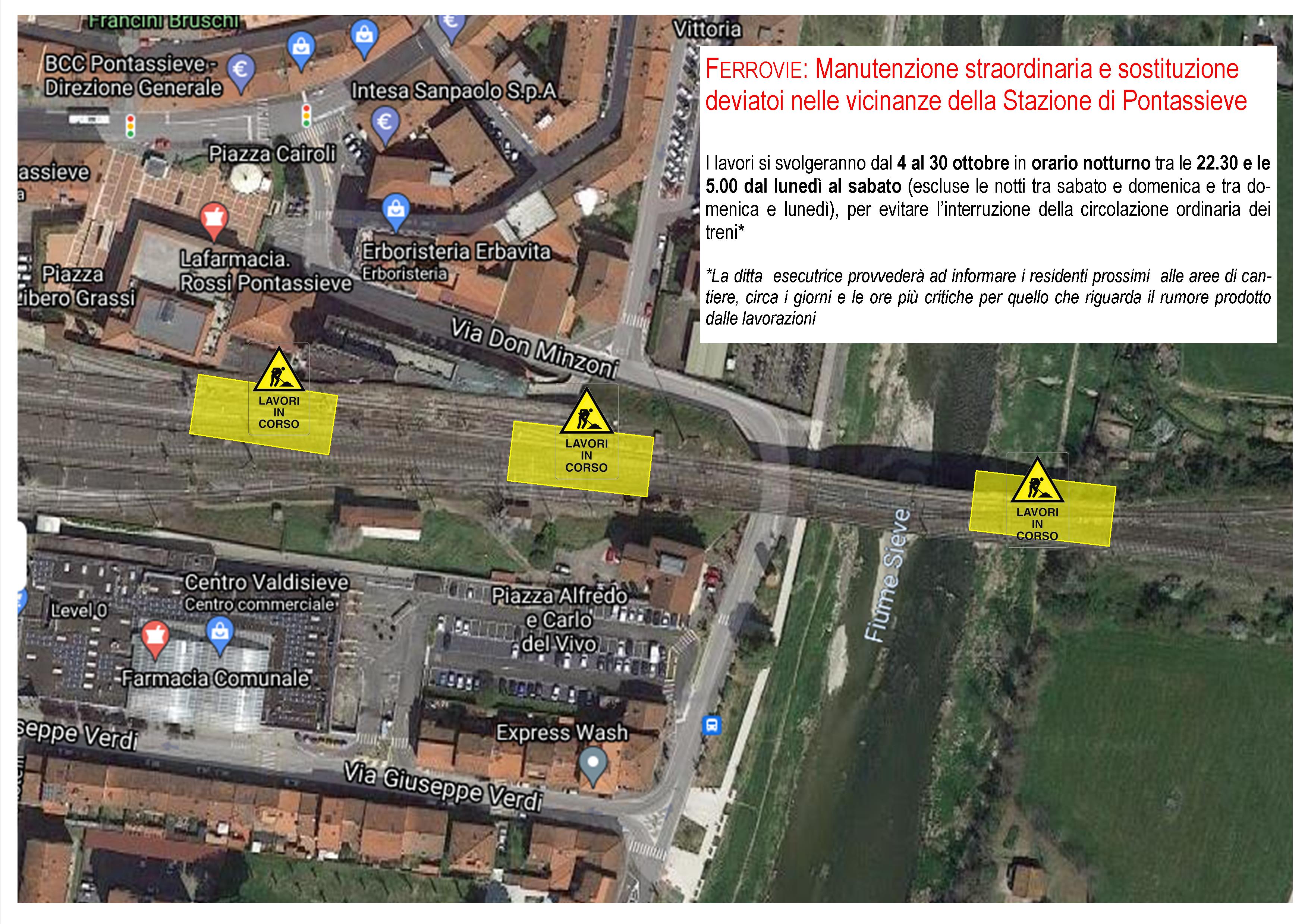 Pontassieve 4/10/2021 - A partire da lunedì 4 ottobre sono in programma una serie di lavori da parte di Ferrovie Italiane per la sostituzione dei deviatoi manutenzione in prossimità della Stazione di Pontassieve, nel tratto in direzione del ponte sulla Sieve.