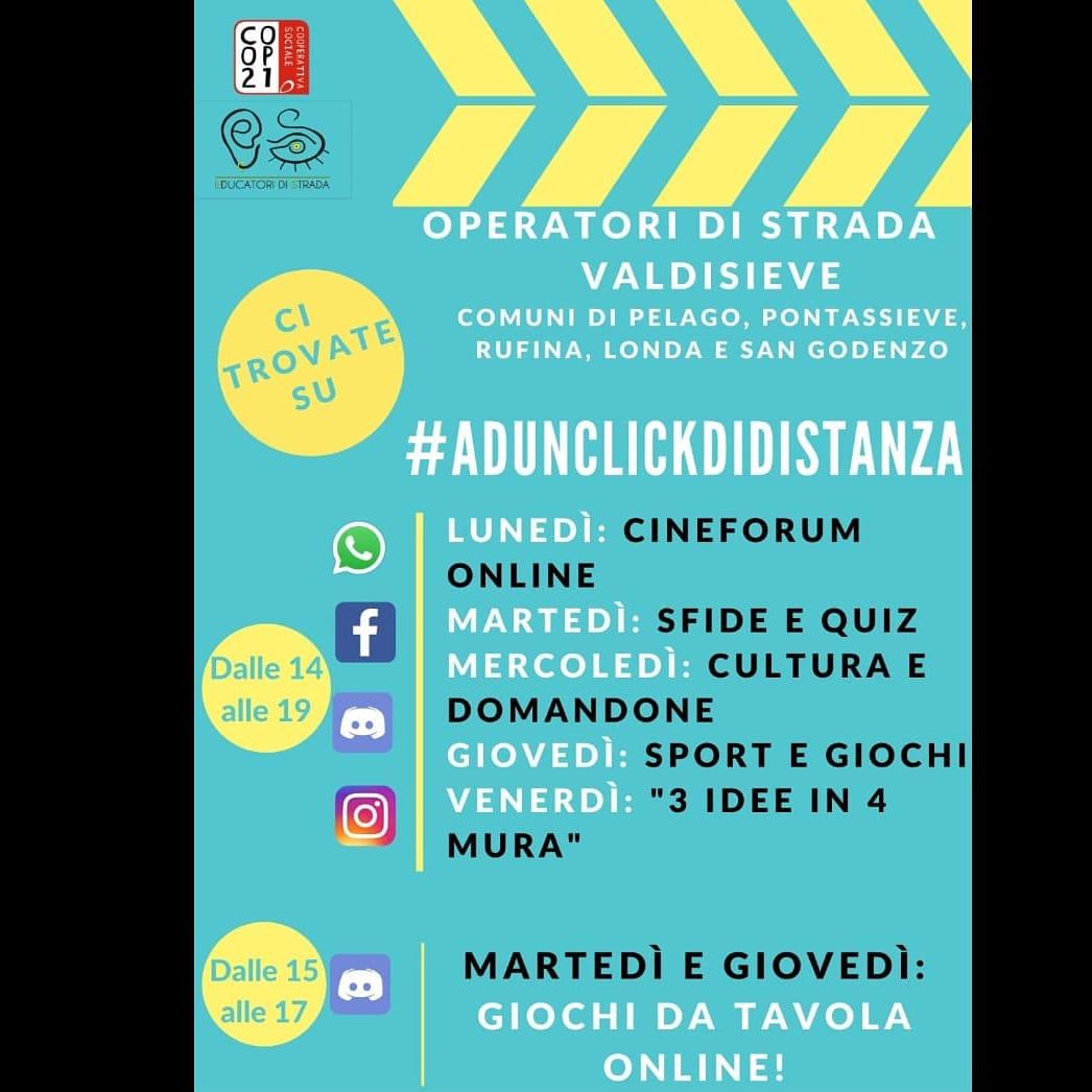 #Adunclickdidistanza è una soluzione per passare in compagnia le giornate divertendosi e tenendo la mente allenata anche da casa, ma anche con lo spirito che contraddistingue la Cooperativa Coop 21 di dare voce, ascoltare e condividere insieme ai ragazzi emozioni, stati d'animo in un periodo particolare come quello che tutti stiamo vivendo.