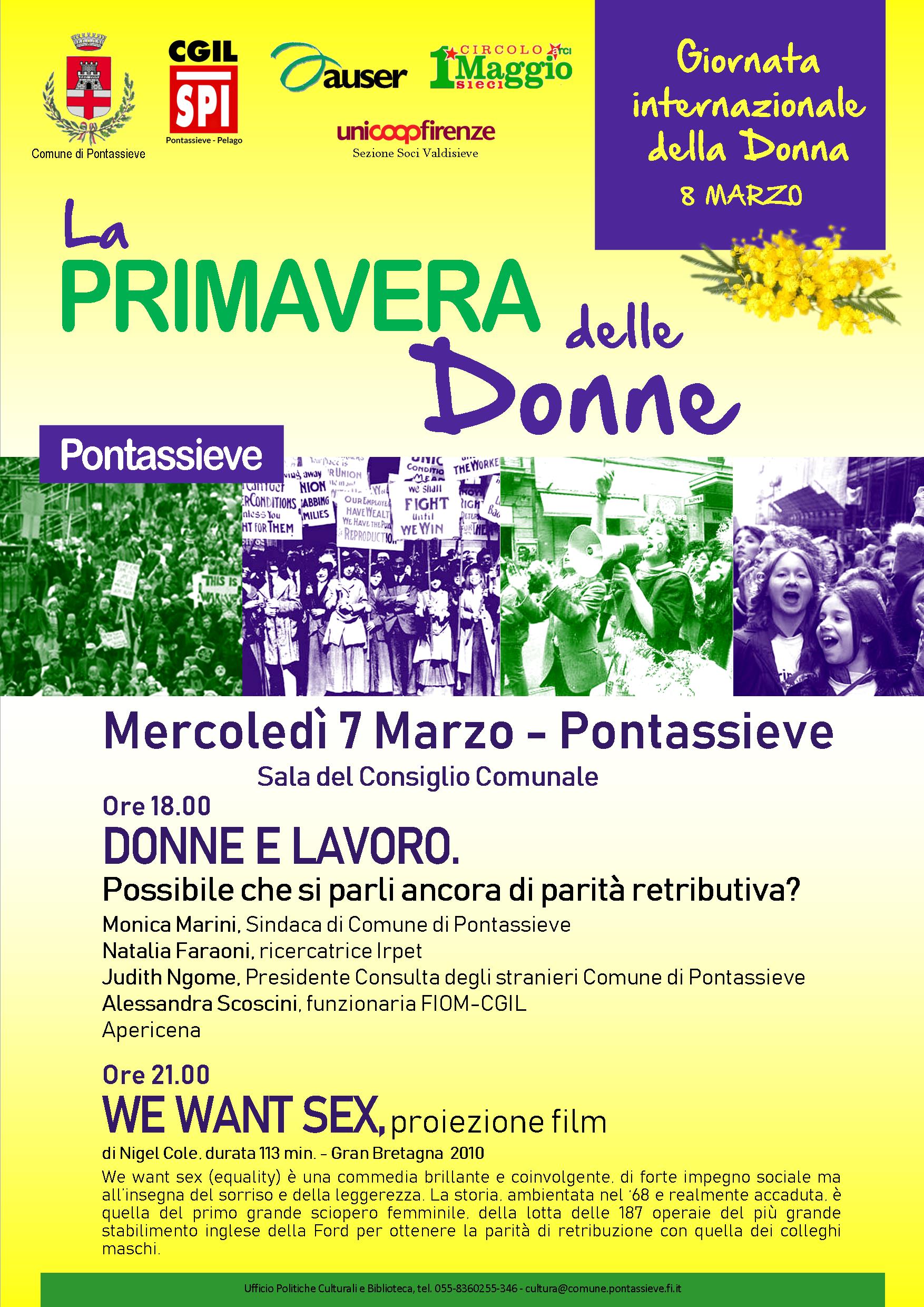 Nel mese di marzo il Comune di Pontassieve, organizza una serie di iniziative volte a sensibilizzare i cittadini sul tema dell'uguaglianza di genere e sull’universo femminile. Cinema, dibattiti, musica che partiranno da domani - mercoledì 7 marzo - con un incontro alle ore 18.00 in sala del Consiglio sul tema della parità salariale con esponenti di enti e associazioni per parlare di donne e lavoro con Monica Marini, Sindaco di Pontassieve, Natalia Faraoni, ricercatrice Irpet, Judith Ngome, Presidente Consulta degli stranieri Comune di Pontassieve e Alessandra Scoscini, funzionaria FIOM-CGIL.