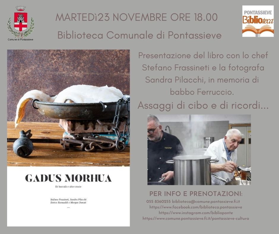 Pontassieve, 19 novembre 2021 - Martedì 23 novembre alle ore 18.00, la Biblioteca comunale di Pontassieve ospita la presentazione del libro Gadus Morhua – di baccalà e altre storie, il volume realizzato da Stefano e Isella Frassineti, i figli di Ferruccio, insieme ai contributi di Sandra Pilacchi, Enrico Romualdi e Morgan Donati.