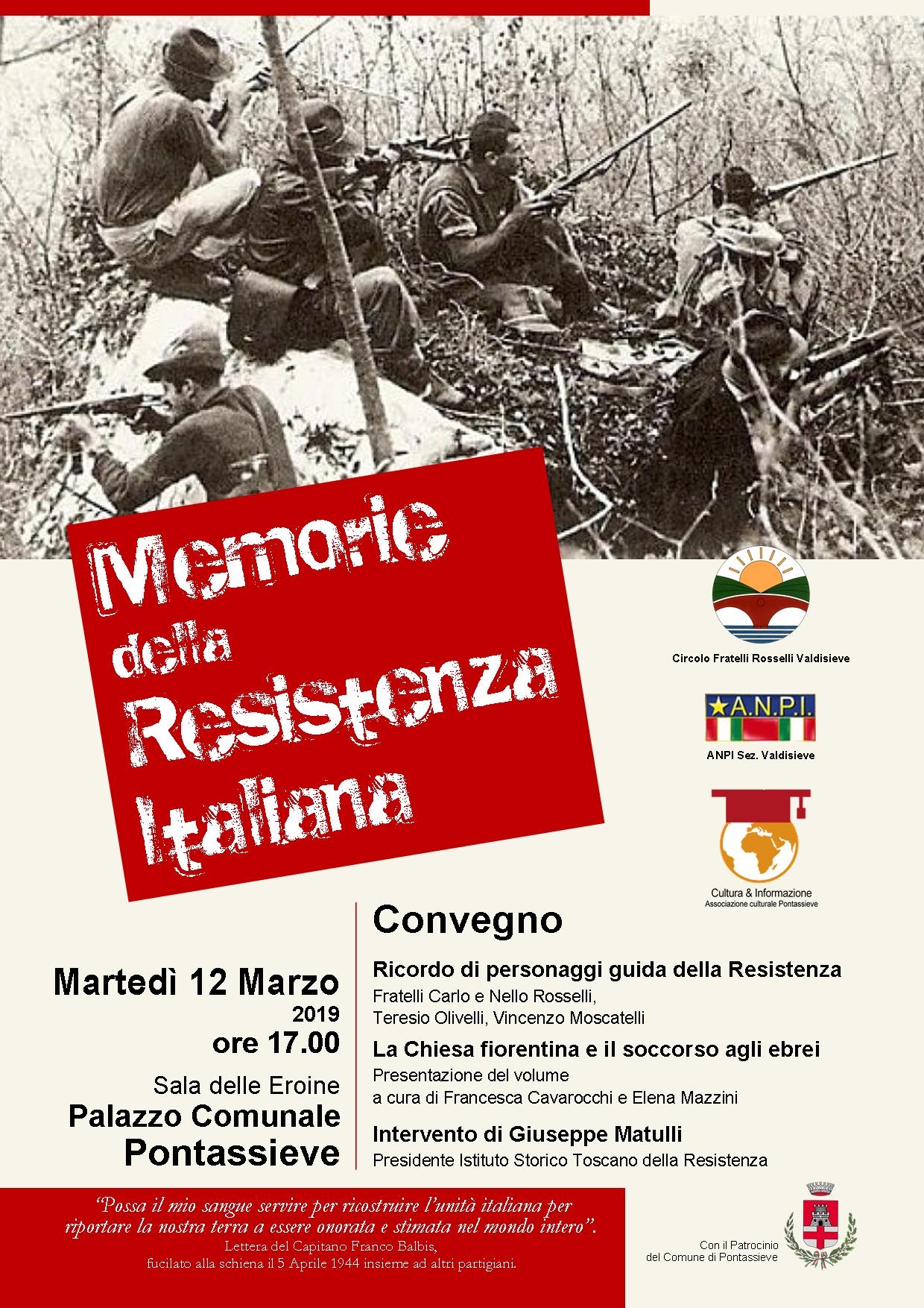 Il Circolo Fratelli Rosselli insieme ad ANPI Valdisieve e Associazione cultura e informazione organizza martedì 12 marzo alle ore 17:00 nella sala delle Eroine del Palazzo comunale il convegno “Memorie della Resistenza italiana”.