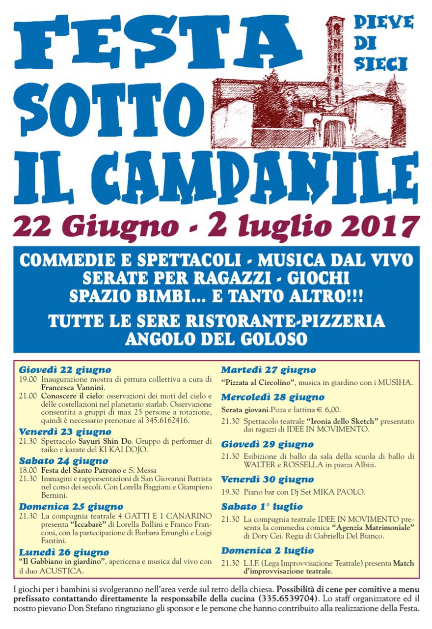 Al via a Sieci, l’edizione 2017 della “Festa sotto il Campanile” con numerose iniziative previste da giovedì 22 giugno fino a domenica 2 luglio.