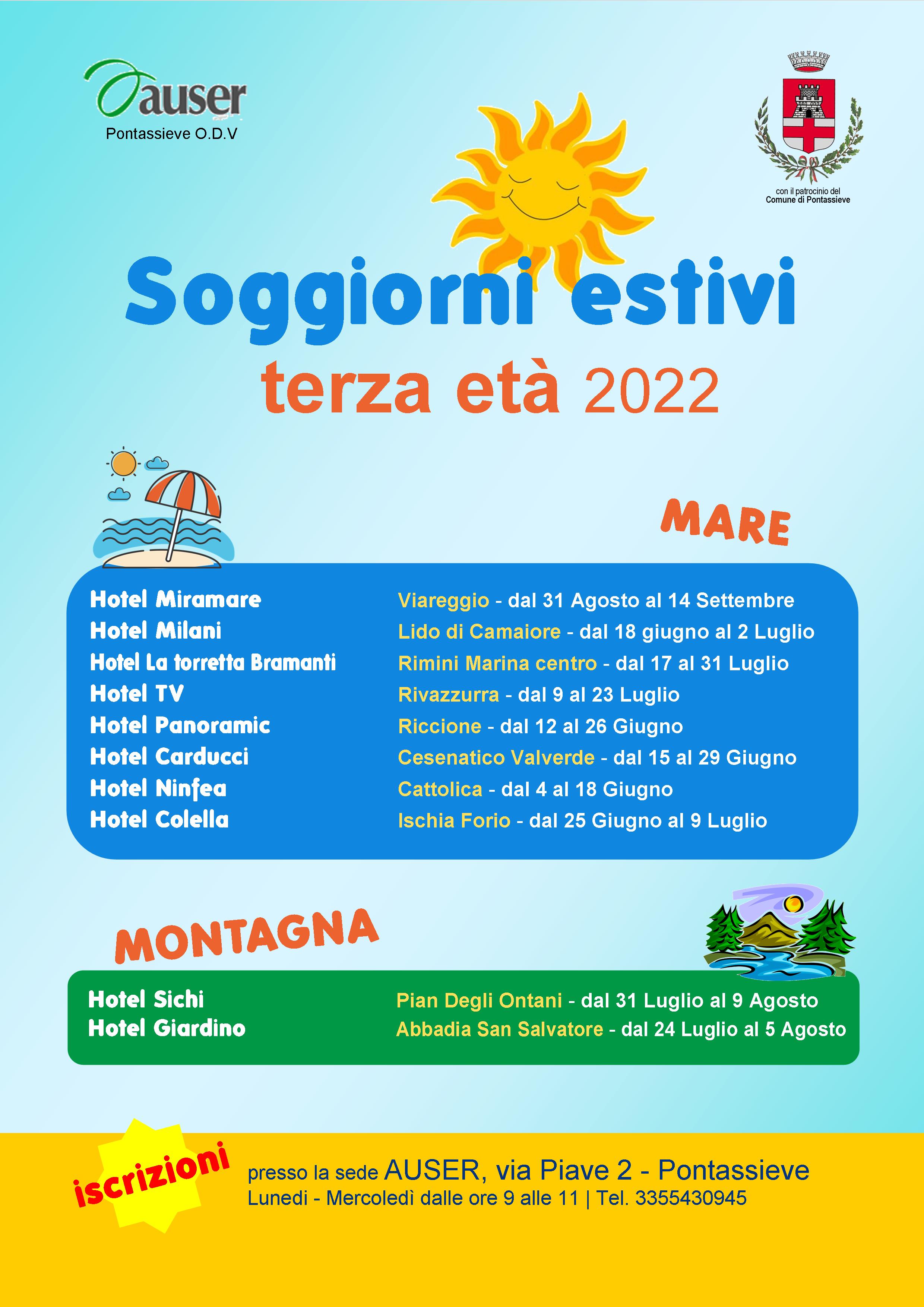 Pontassieve 5 aprile 2022 - Ripartono i soggiorni estivi 2022 per la terza età promosso da Auser Pontassieve. Le destinazioni sono tante: dal mare alla montagna, dalla Versilia alla costa adriatica fino alle Montagne della nostra Regione, per un’offerta cha va giugno a settembre.